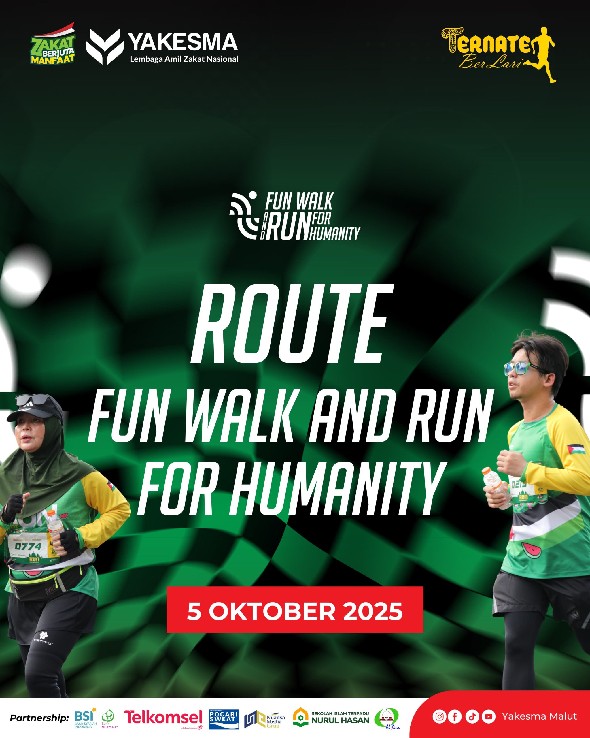 Tivanusantara – Lembaga Amil Zakat Nasional Yakesma Maluku Utara bakal menggelar Fun Walk and Run For Humanity 5K di Landmark Kota Ternate, Minggu (5/10) mendatang. Event ini sekaligus mengundang masyarakat untuk terus menebarkan kepedulian dan mendukung kemerdekaan Palestina.