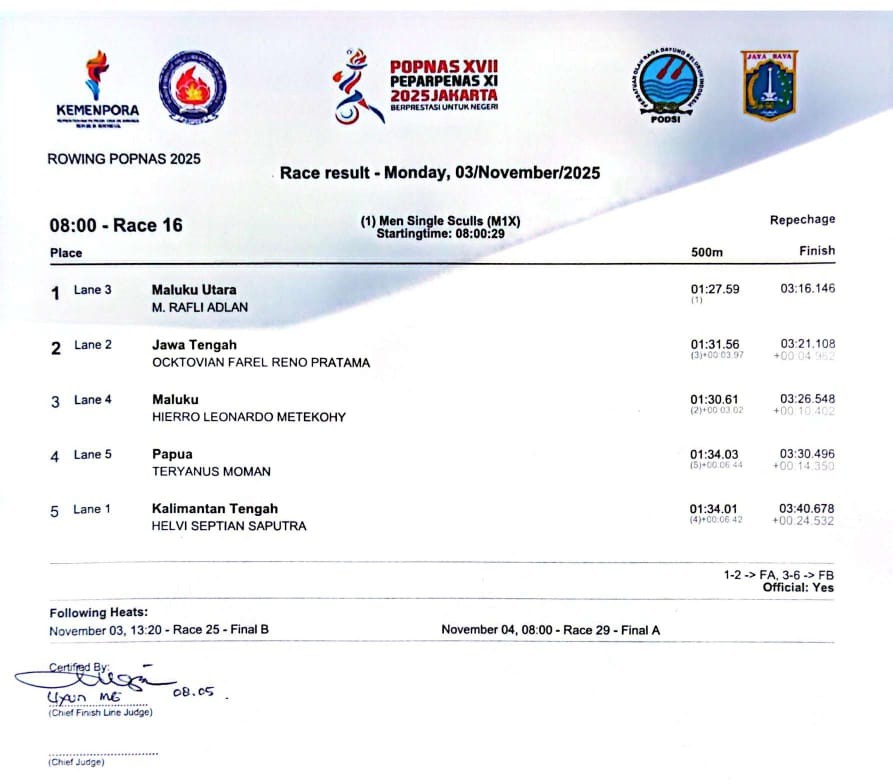 Tivanusantara – Kontingen atlet dayung Maluku Utara (Malut) mencatatkan prestasi membanggakan di Pekan Olahraga Pelajar Nasional (POPNAS) XVII 2025 di Jakarta. Setelah melalui babak penyisihan yang ketat, dua nomor perlombaan dayung (rowing) berhasil memastikan tempat di partai final yang akan digelar pada Selasa (4/11) besok.