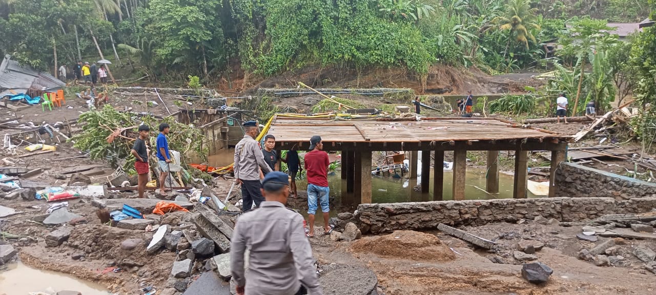 Aparat kepolisian dari Polsek Ibu, Polres Halmahera Barat, diterjunkan untuk membersihkan sisa-sisa material, lumpur dan potongan-potongan kayu hingga rumput dari dampak banjir yang menutup akses jalan dan jembatan di Desa Gamlamo dan Kampung Cina Desa Tongute Ternate Asal.