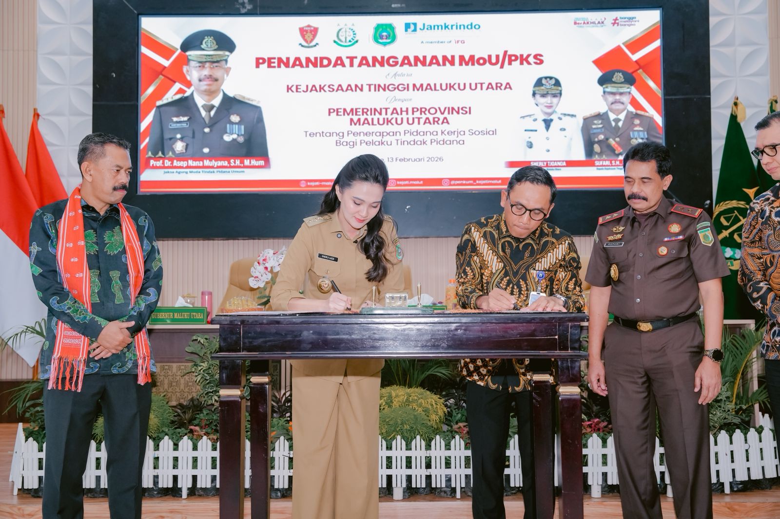 Tivanusantara – Pemerintah Provinsi Maluku Utara dan Kejaksaan Tinggi (Kejati) Malut resmi menandatangani Nota Kesepahaman (MoU) tentang Kerja Sama Pelaksanaan Pidana Kerja Sosial bagi pelaku tindak pidana, bertempat di Aula Fala Lamo Kejati Malut, Jumat (13/2). MoU tersebut bernomor B-06/Q.2/Es/02/2026 dan 100.3.7.1/768/MU/2026.